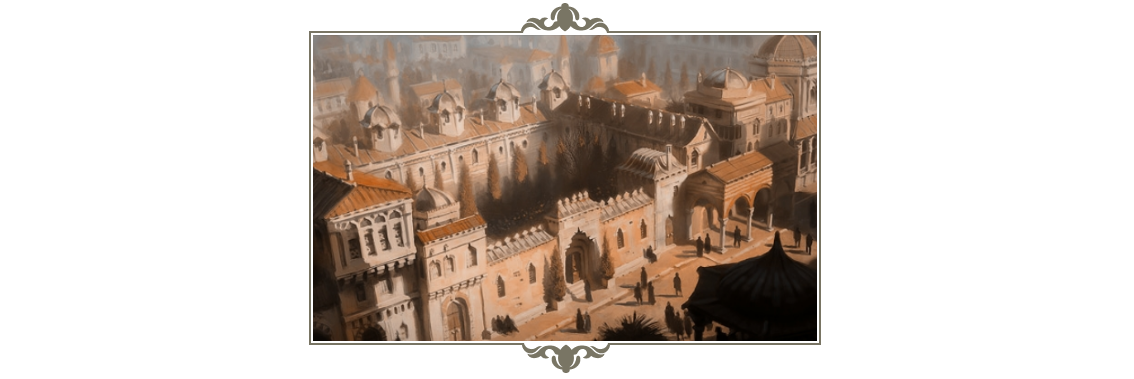 Au bout de l’avenue, après la plaisante place des Victoires, apparaît le cossu Castel des Fines Fleurs. Le château fortifié et entouré de hautes tours demeure un excellent lieu stratégique tout en affichant une architecture très ornementale. Ainsi, les cours intérieures, les arches, les jardins aux haies taillées et les fontaines sont nombreuses parmi les basses et hautes cours de la demeure et donne à l’endroit une prestance reconnue par tous ceux ayant la chance de s’en approcher. Traversée par le modeste système d’égouts de Rosenza, l’Avenue des Soieries demeure un lieu à la propreté satisfaisante et où il fait bon vivre en raison de la sécurité apportée par les constantes patrouilles des milices des familles honorables et du comte.