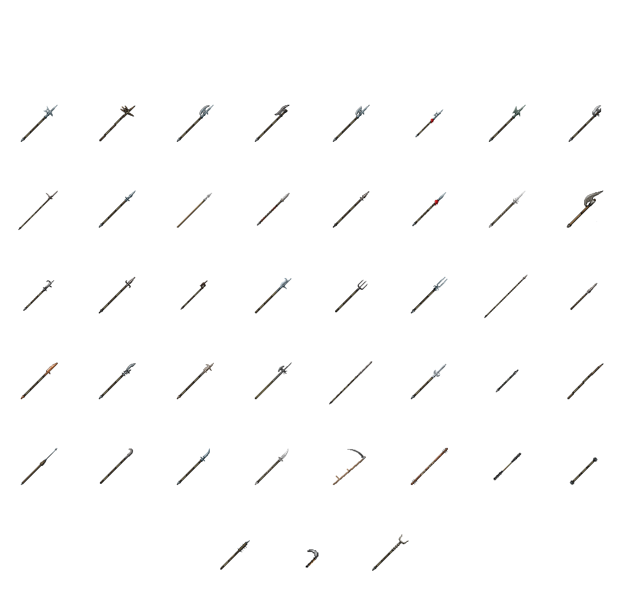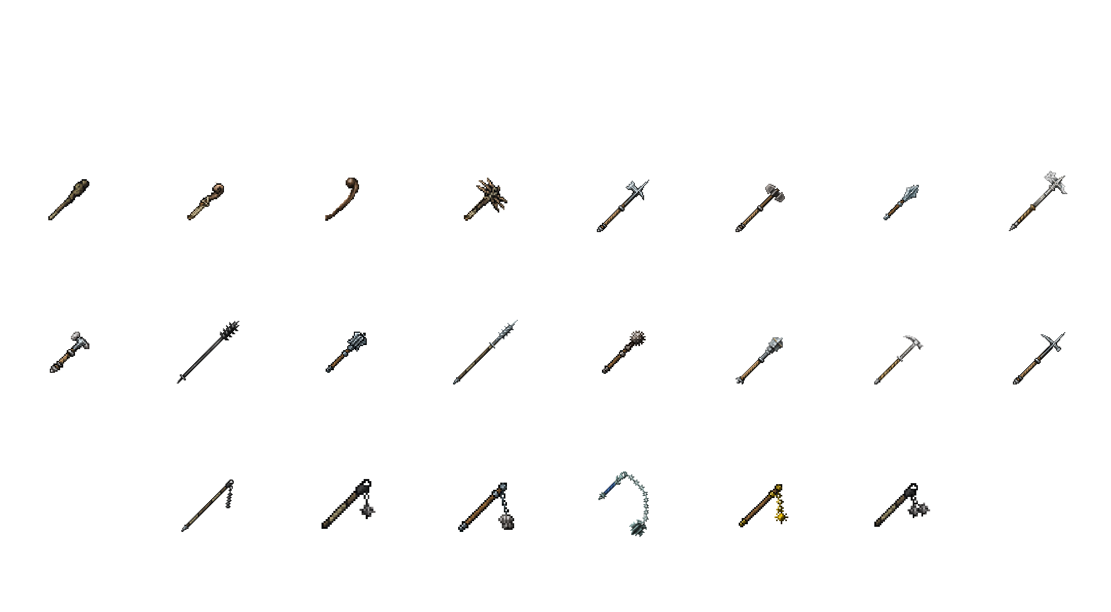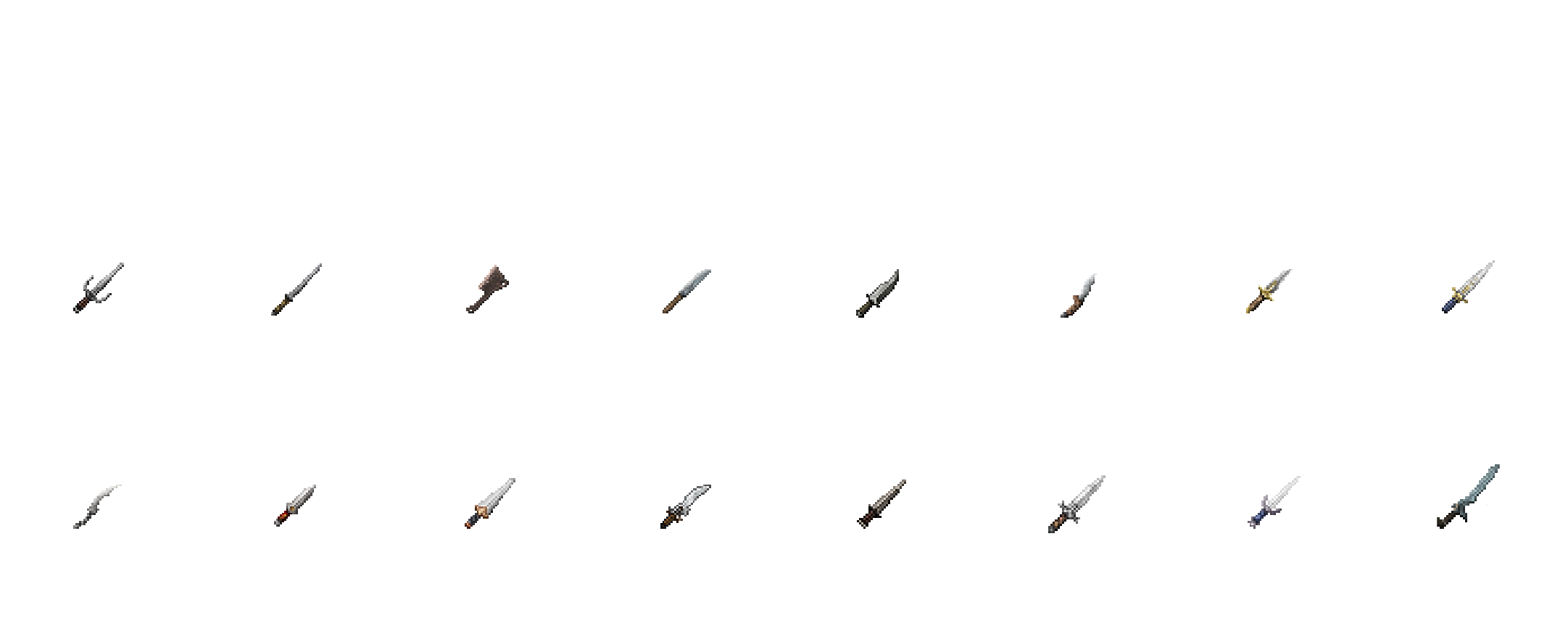 Toutes ces armes sont des rename des outils de base (épées, haches, pioches, etc.), adaptés visuellement et narrativement à l’univers.