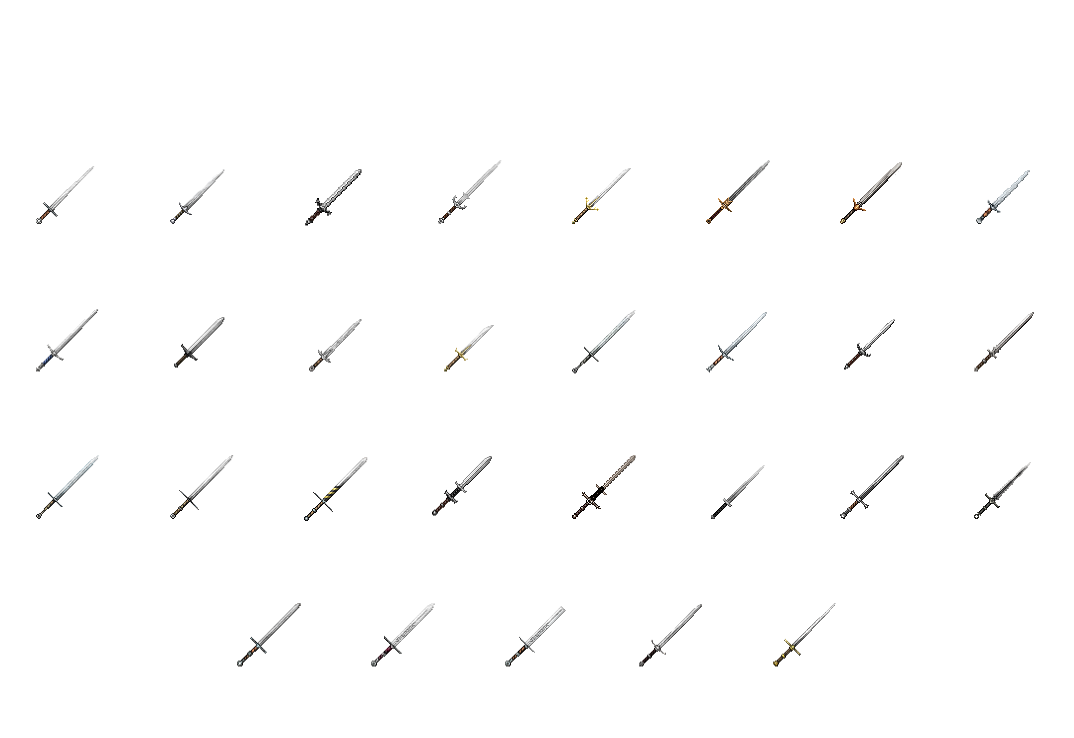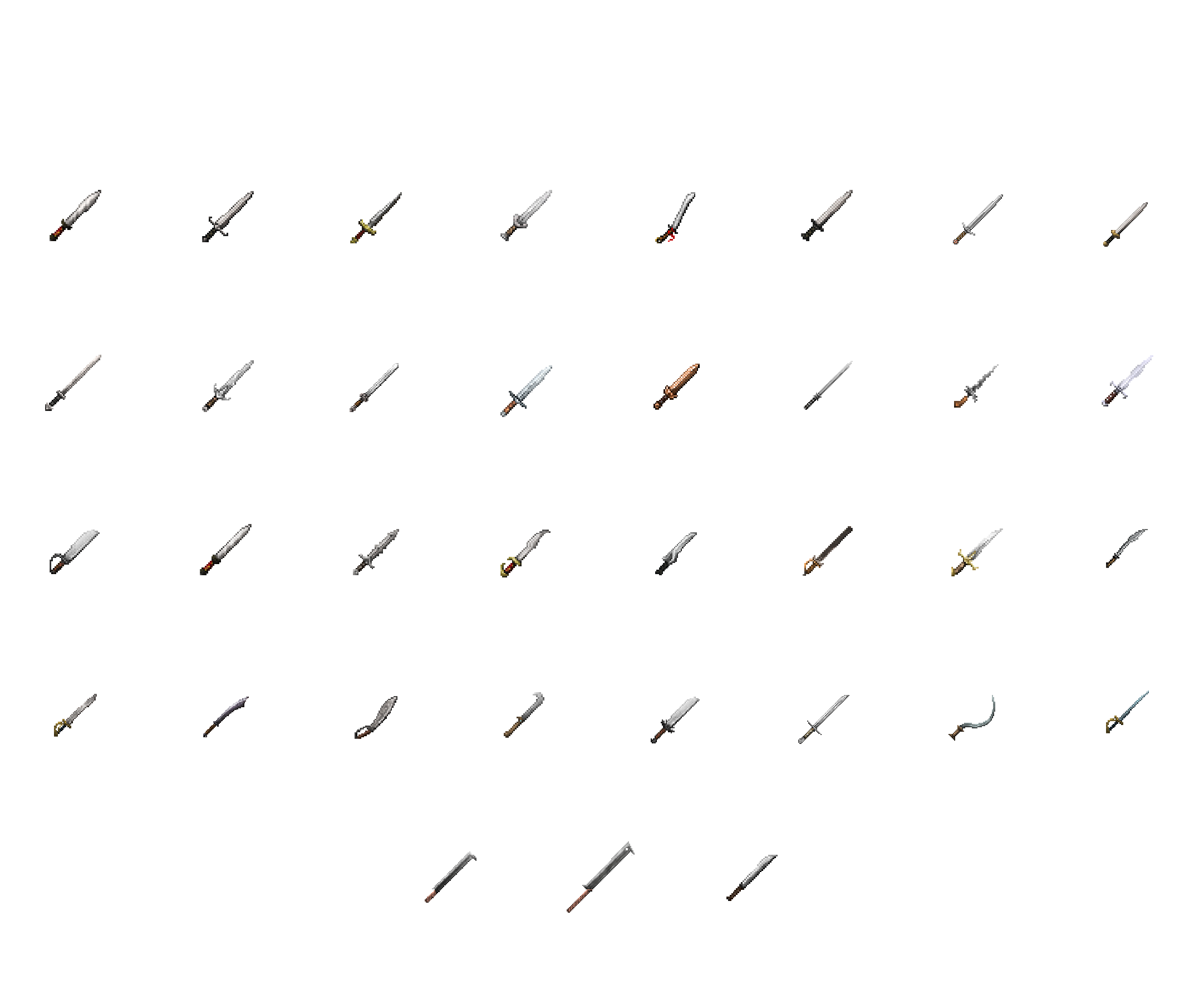 ¶ Épée basique¶ Épée courte¶ Épée courte ouvragée¶ Épée à lame courte¶ Lame courte inclinée¶ Épée droite¶ Épée simple en fer (Uniquement fer)¶ Épée simple d'acier (Uniquement acier)¶ Épée simple ouvragée¶ Épée ouvragée¶ Épée ornée¶ Épée d'acier (Uniquement acier)¶ Épée de bronze (Uniquement fer)¶ Épée sans garde¶ Épée asymétrique courte¶ Épée à lame concave¶ Épée papillon¶ Glaive¶ Épée dentelée ornée¶ Rapière¶ Sabre de fer ouvragé (Uniquement fer)¶ Sabre à embout plat¶ Sabre droit¶ Sabre orné¶ Cimeterre¶ Coutelas¶ Épée courbe basique¶ Falx¶ Fauchon¶ Falcata¶ Messer¶ Épée-faucille¶ Machette plate¶ Machette simple¶ Longue machette à deux mains¶ Machette ancienne |
