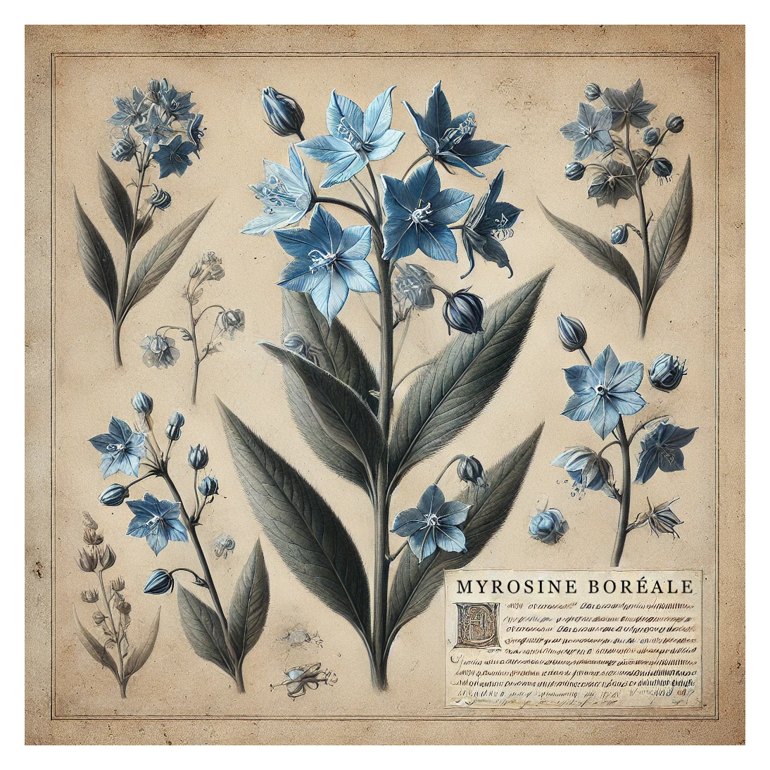 Teinture fragile : Les pétales bleus de la Myrosine boréale produisent une teinture délicate de couleur azur pâle. Cette teinture est parfois utilisée pour teindre des étoffes légères et fluides ou des parchemins décoratifs, souvent réservés aux cérémonies religieuses ou aux manuscrits de grande valeur. Cependant, la fragilité de la couleur rend son usage limité, et elle est principalement employée pour des travaux nécessitant finesse et précision. Quoiqu’il en soit, comme en cuisine, son usage est associé au luxe et au raffinement.
