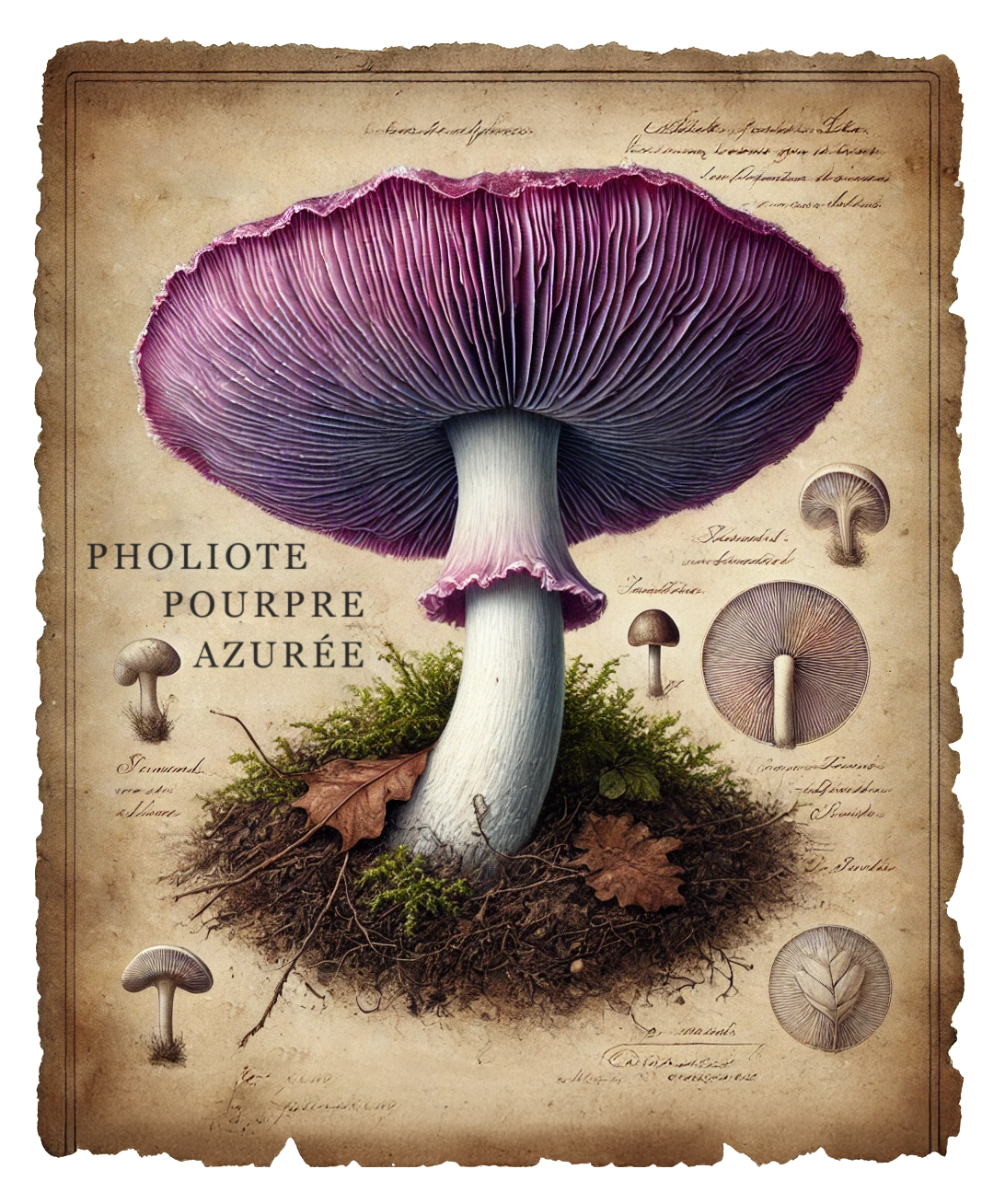 La Pholiote Pourpre-Azurée est un champignon remarquable par son chapeau pourpre velouté, légèrement bombé et orné de bords délicatement frangés. Le contraste saisissant entre ce chapeau d’une profondeur chromatique presque hypnotique et son pied élancé d’un blanc immaculé lui confère une élégance rare dans le monde fongique. Le chapeau, mesurant entre 5 et 10 cm de diamètre, semble absorber la lumière ambiante, créant un jeu subtil d'ombres et de reflets violacés.